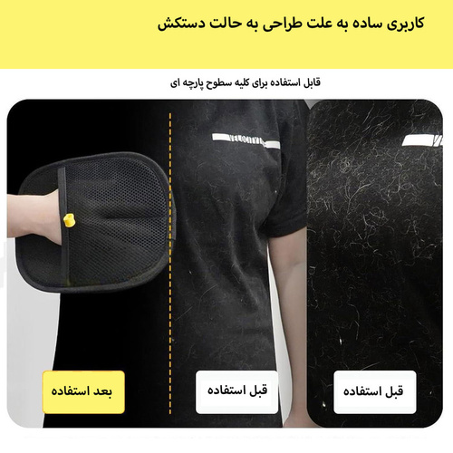 اگر از پرز و موی حیوان خانگیتان روی لباس و وسایل خانه خسته شدهاید، دستکش پرزگیر موی حیوانات یک راهحل انقلابی و فوقآسان برای نظافت خانه و آراستن (حذف موهای مرده از بین موهای زنده) حیوان خانگی شماست! این دستکش با طراحی هوشمندانه، به شما امکان میدهد به راحتی و تنها با حرکت دادن دست، همهجا را تمیز کنید و حیوان خانگی خود را شانه بزنید. از ویژگیهای منحصر به فرد این محصول میتوان به موارد زیر اشاره کرد: · حذف مو و پرز در یک حرکت: سطح مخصوص این دستکش به راحتی موها، کرک و پرزها را از روی هر سطح پارچهای مانند مبل، روتختی، پتو، لباس و صندلی ماشین جمعآوری میکند. · ابزاری ایدهآل برای Grooming (آراستن): از این دستکش مستقیماً روی بدن گربه یا سگ خود استفاده کنید! این کار نه تنها موهای مرده و اضافی را به راحتی جمع میکند، بلکه یک ماساژ لذتبخش برای حیوان شماست و پیوند شما را با او تقویت میکند. · قابلیت شستشوی آسان و سریع: کیفیت بالا و قابل شستشو بودن این دستکش، نگهداری آن را بسیار راحت کرده است. کافی است پس از استفاده، آن را زیر آب بگیرید و تمام موهای چسبیده را به سادگی بشویید و برای استفاده بعدی آماده کنید. · طراحی ارگونومیک و راحت: مانند یک دستکش معمولی به دست میرود و استفاده از آن بسیار ساده است. هیچ زحمتی ندارد و به راحتی به تمام سطوح و نقاط بدن حیوان میرسد. · ساختار بادوام و چندبار مصرف: این دستکش برخلاف نوار چسبهای پرزگیر، ماندگاری بسیار بالایی دارد و با شستشوهای مکرر کیفیت خود را از دست نمیدهد.